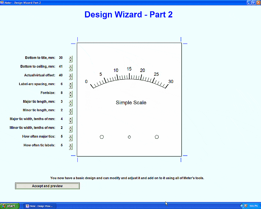 Estes programas — Meter e MeterBasic — são projetados para que um computador faça o trabalho duro de fazer uma balança de precisão para um medidor analógico d’Arsonval. As escalas resultantes podem parecer tão boas (ou melhores!) quanto as encontradas nos medidores comerciais.